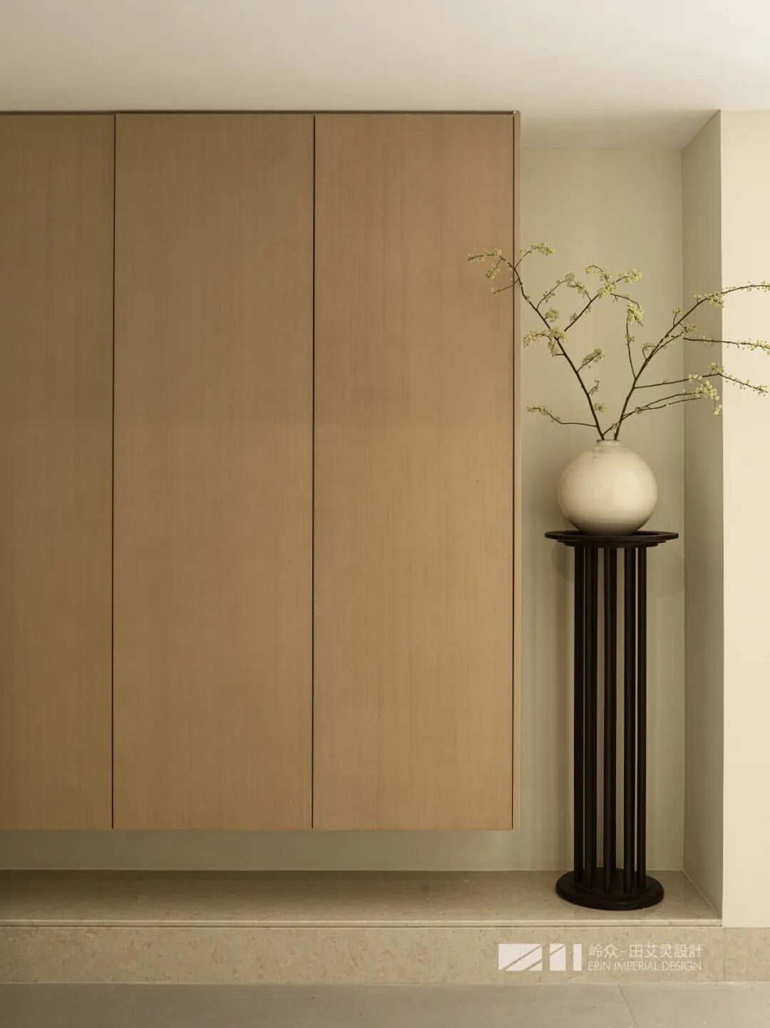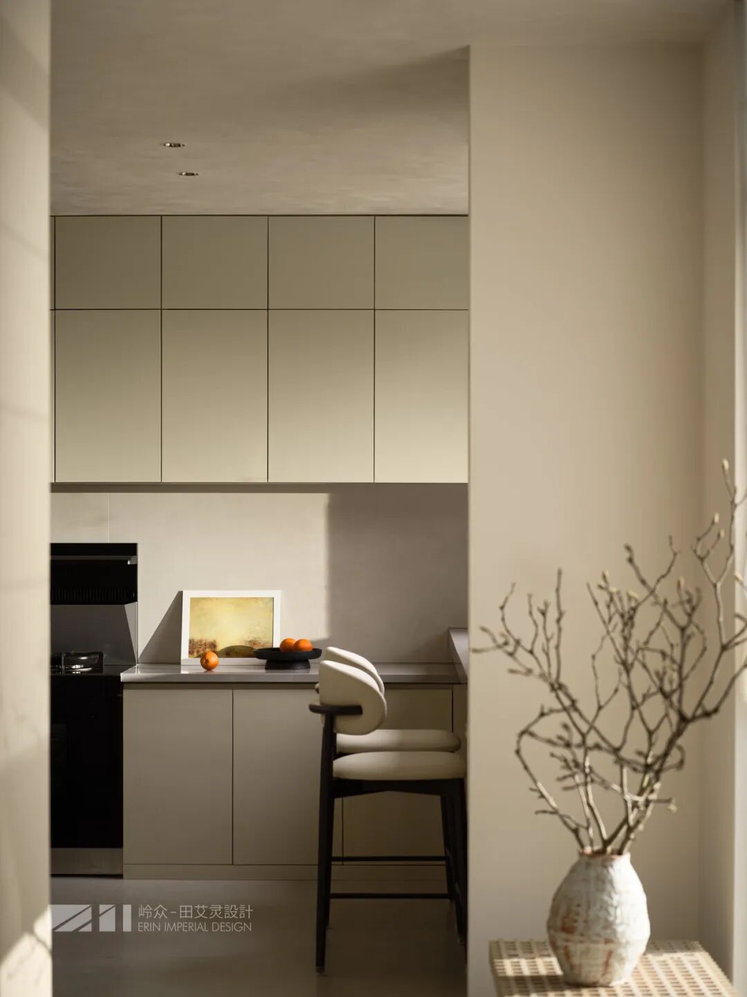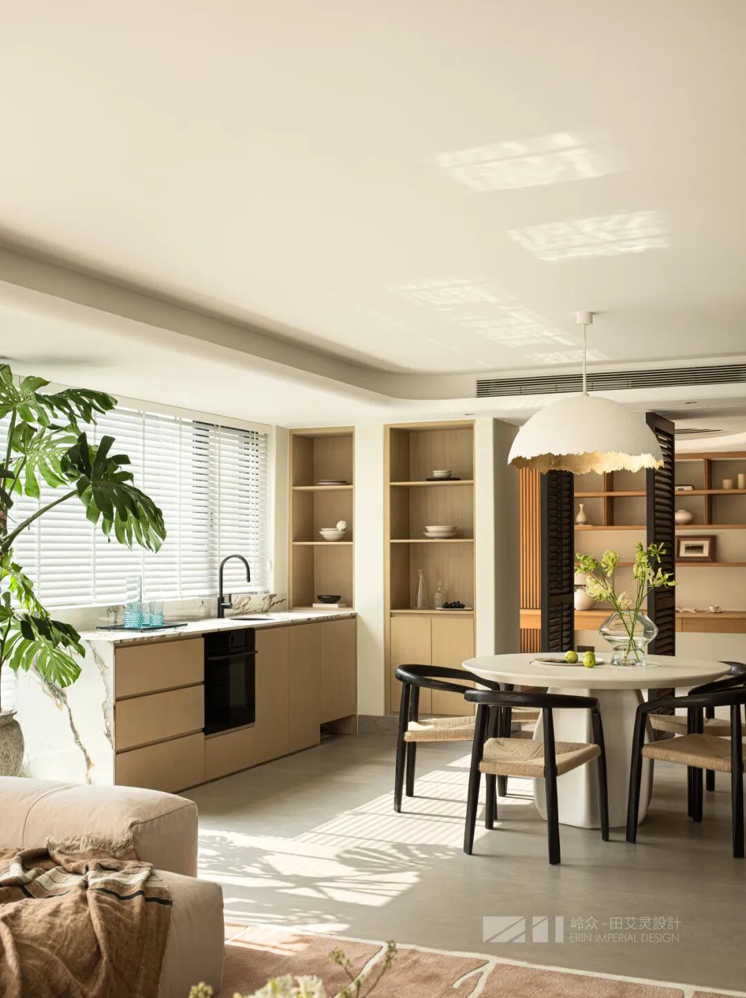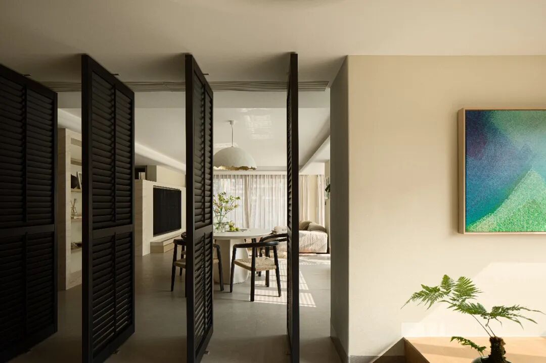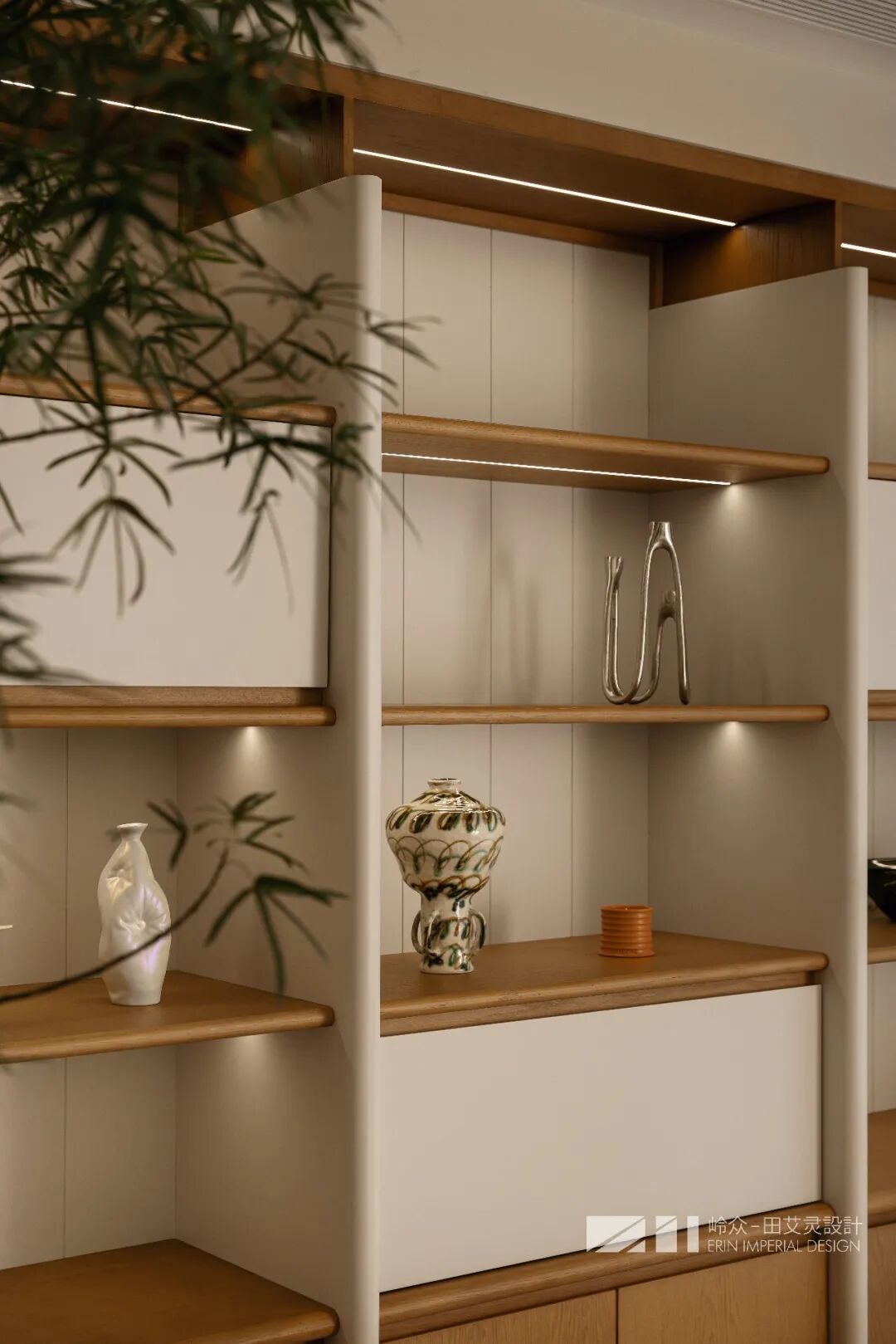 每一处质感都是反复筛选比对出有层次的度,不多不少。厅边的收纳陈列区精选的沙漠色石材低调的衬出浅色木调柔和;转轴的灰黑哑光质感百叶门拉出空间的骨骼线;再到饱满温暖的木色多功能柜,与透纳那描述感受而非实景的表达,与那阔叶的、秀美的绿色……