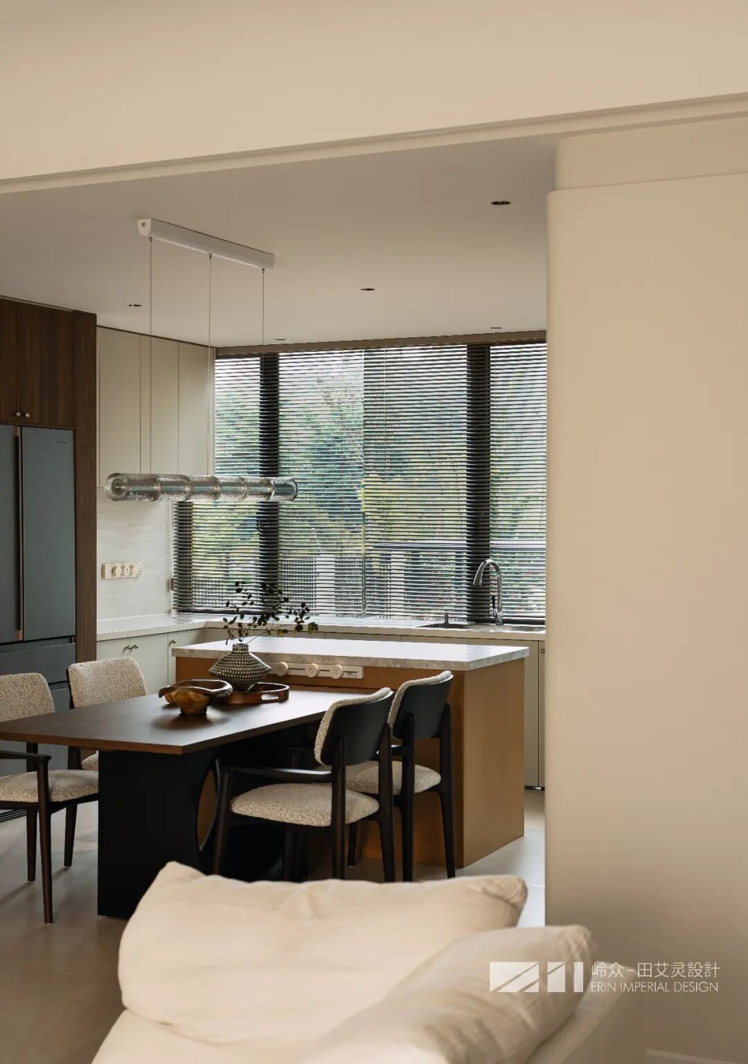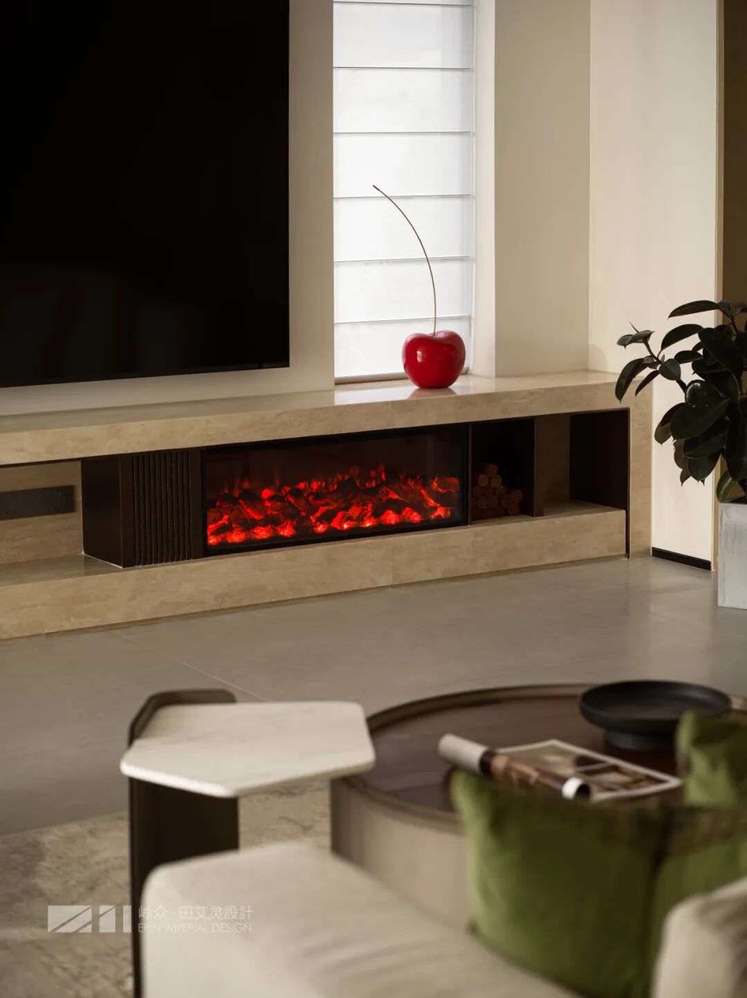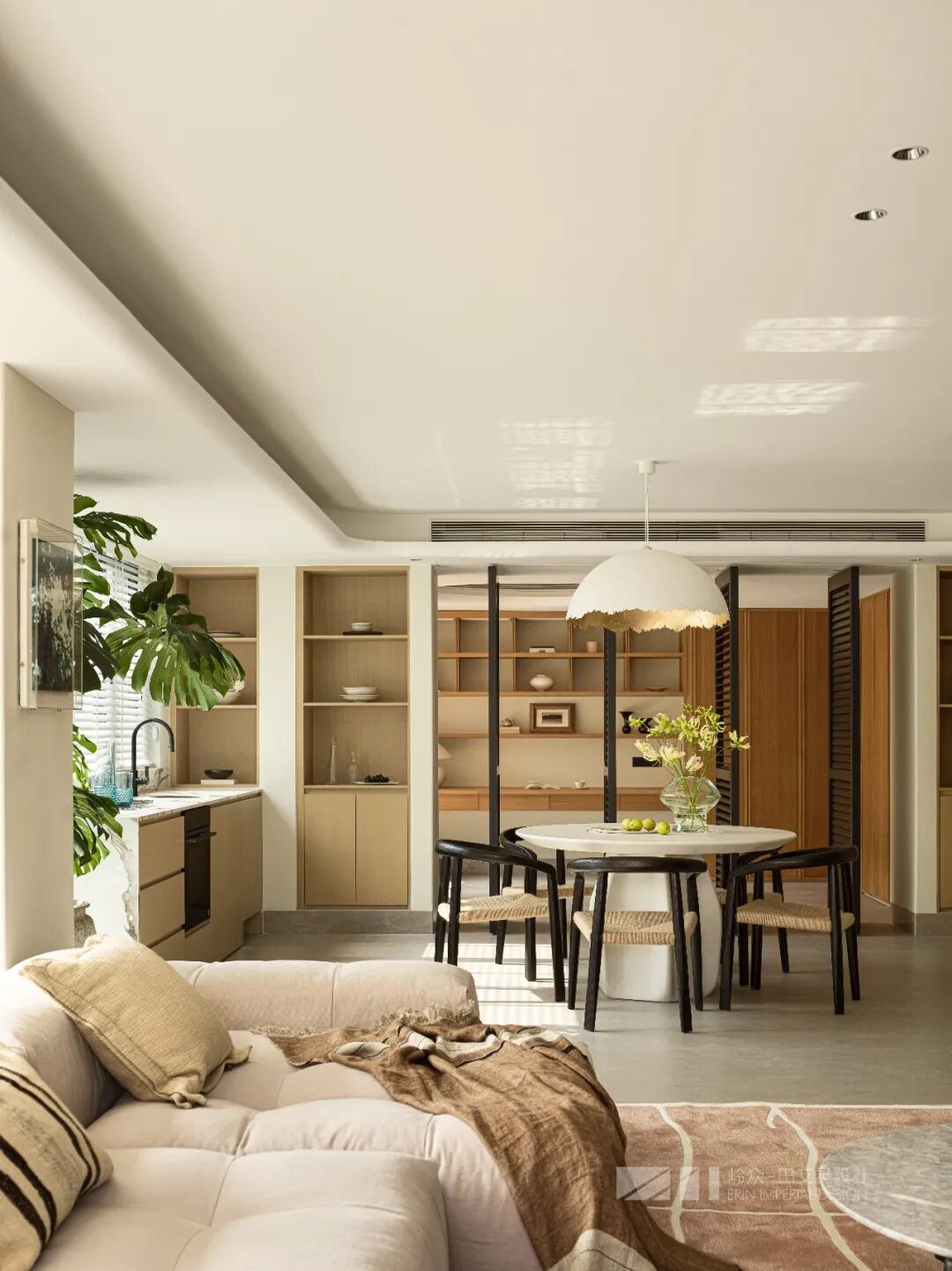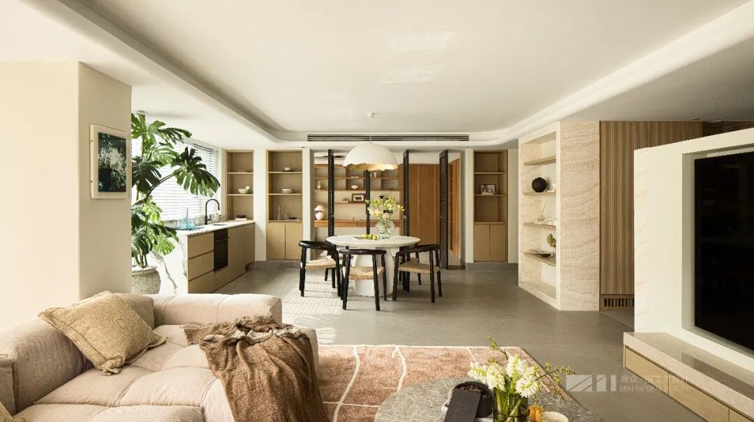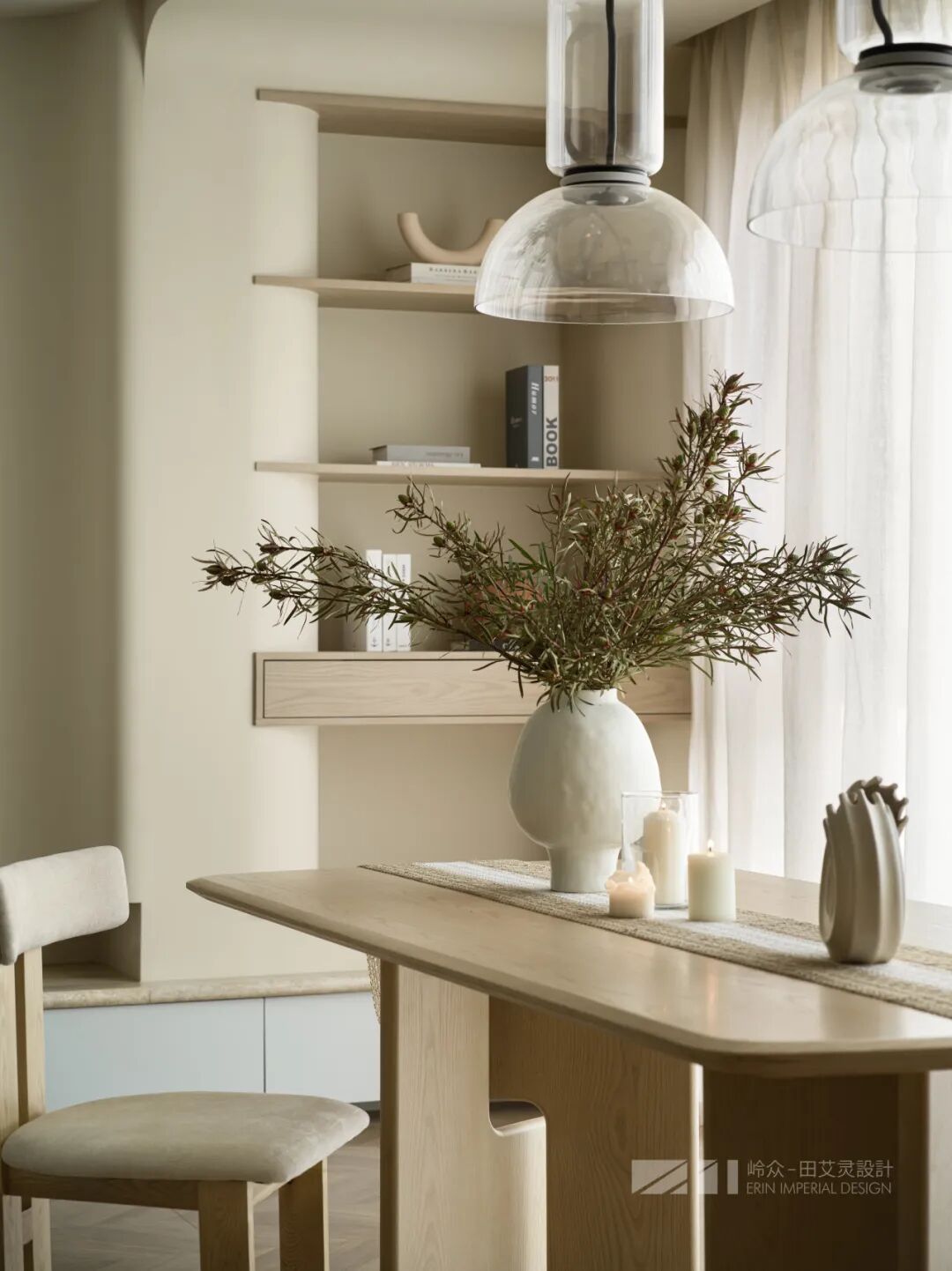 每一处质感都是反复筛选比对出有层次的度,不多不少。厅边的收纳陈列区精选的沙漠色石材低调的衬出浅色木调柔和;转轴的灰黑哑光质感百叶门拉出空间的骨骼线;再到饱满温暖的木色多功能柜,与透纳那描述感受而非实景的表达,与那阔叶的、秀美的绿色……