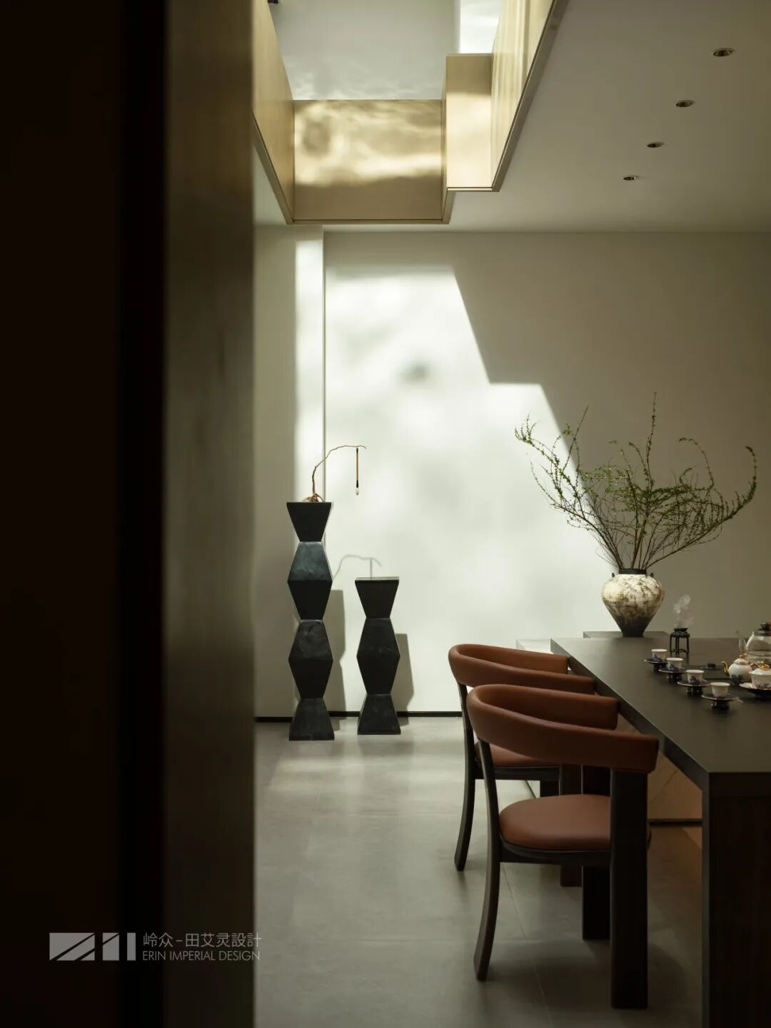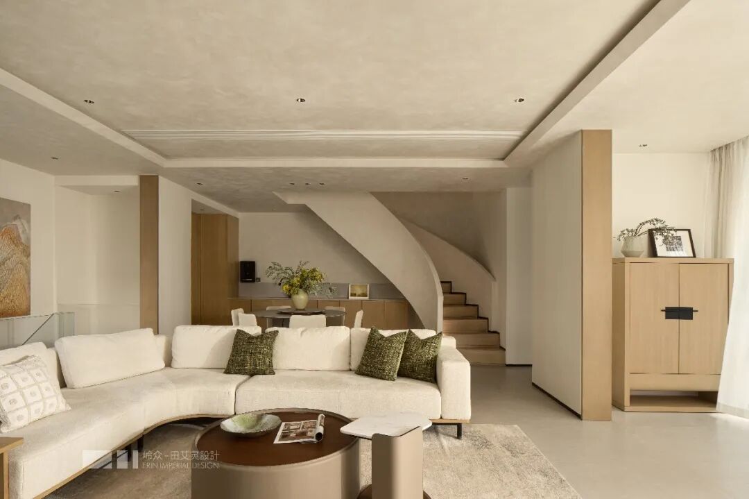 以「自然为诗,雅致为境」,秉持着回归自然的平和期许与可持续的设计理念,一切品位和质感,皆在此基础上诞生。在空间界面的交错中,巧妙利用光影与几何比例形成曲直交错的秩序之美,在纯粹里融入了温柔与放松的慵懒。