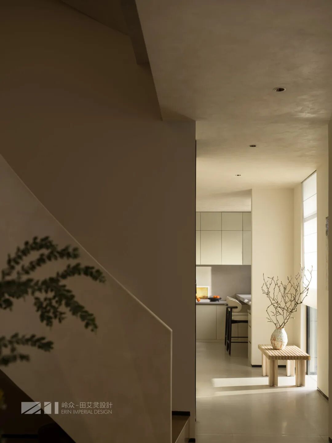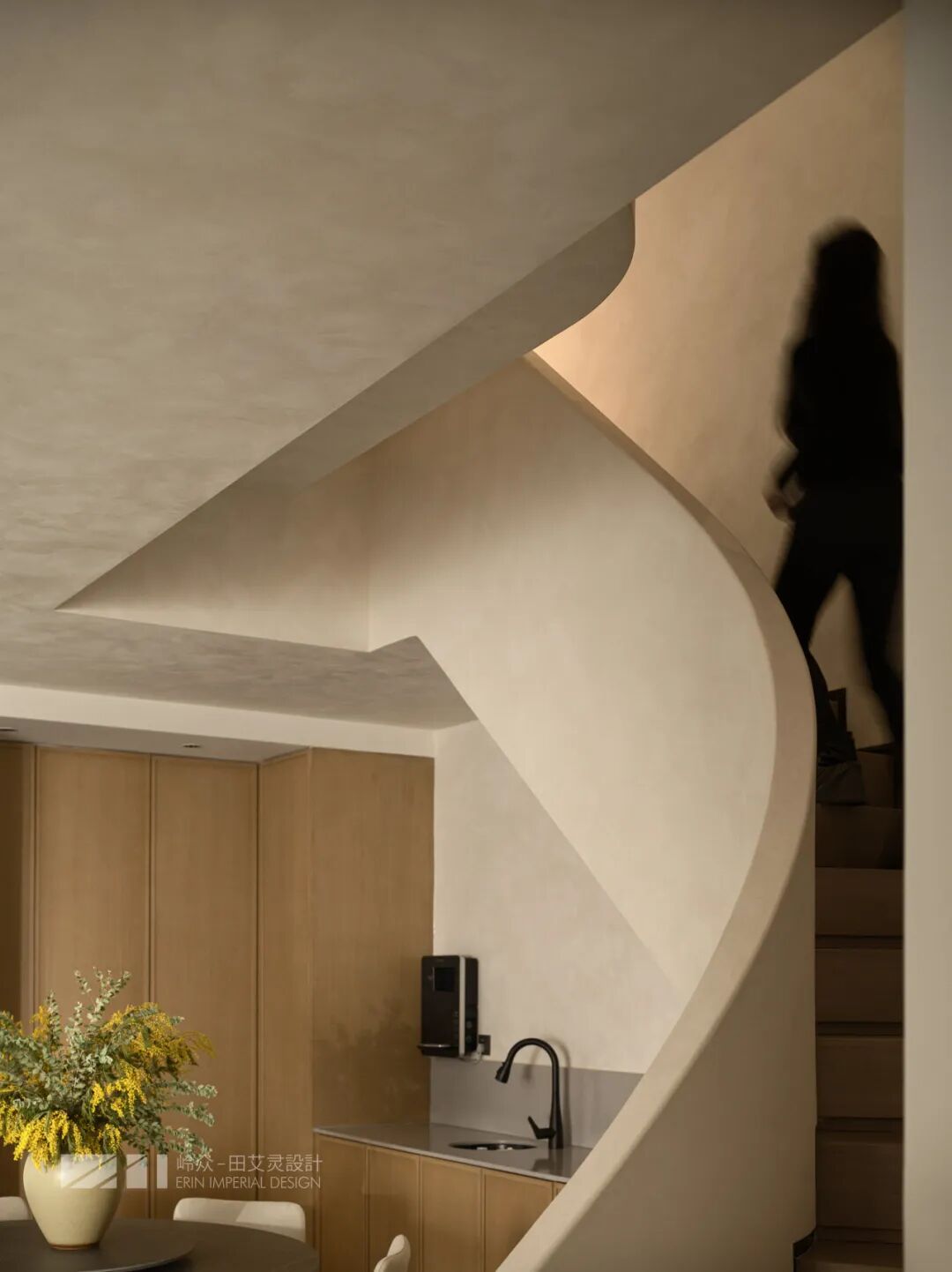 楼梯的设计也被重新考虑,流畅的曲线让整个空间聚焦,诗意的动态感和艺术感同时保持了与空间和谐的视觉关系,在有限的空间内谱写一段优雅的过渡。