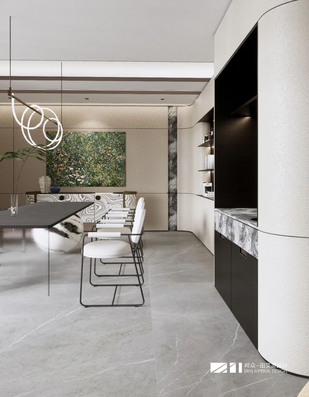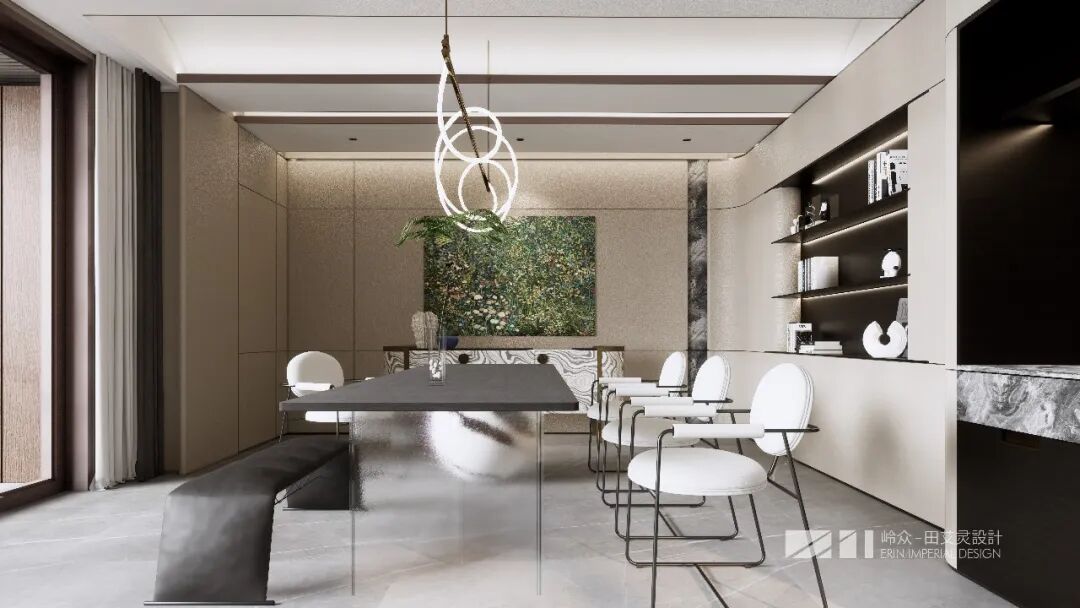 Restaurant space emphasizes the balance between functionality and artistic sense. The long dining table with transparent glass legs is light and transparent, and the white dining chair forms a visual contrast with the dark bench, enriching the spatial level. Klimt-style oil painting becomes the visual focus, allowing art and nature to talk in space. The combination of open bookshelves and marble countertops not only meets the storage needs, but also enhances the texture and style of the space.
